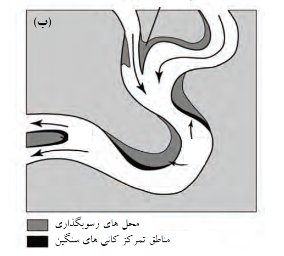 کانی های سنگین ضمن حركت رسوبات کف رودخانه در یک لایه ضخیم تمرکز می یابند. در این لایه ضخیم از رسوبات که به لایه فعال موسوم است، سرعت جابجائی مواد غیر یکنواخت است؛ در پایین لاية فعال به دلیل جابجائی از طرق لغزیدن، سرعت جابجائی کم است؛ در حالی که در بالای آن به دلیل جهش و غلطیدن رسوبات، سرعت جابجائی مواد زیاد است؛ لذا بین بخش پائینی لایه فعال که در آن دانه ها درشت و سنگین می باشند و بخش بالایی که در آن دانه ها ریز و سبک هستند، نوعی تفریق و جدایش صورت می گیرد. لیکن طبق وليكانوف (۱۹۵۵) انتقال دانه های کانی سنگین و باطله در درون یک لایه فعال صورت نمی گیرد؛ بلکه انتقال دانه ها بر روی سطح رسوبات آبرفتی، ضمن بهم خوردن دانه های ریز و پرش دانه های سنگین تر و درشت تر انجام می شود.