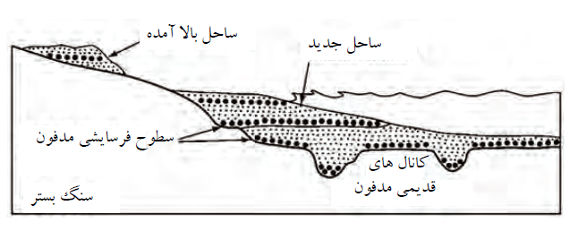 بافت/ساختار: اندازه دانه با فاصله از ناحیه منبع کاهش می یابد. دانهها و قطعات درشتتر نادر هستند، به جز در کانالهای شیبدار رودخانهای .