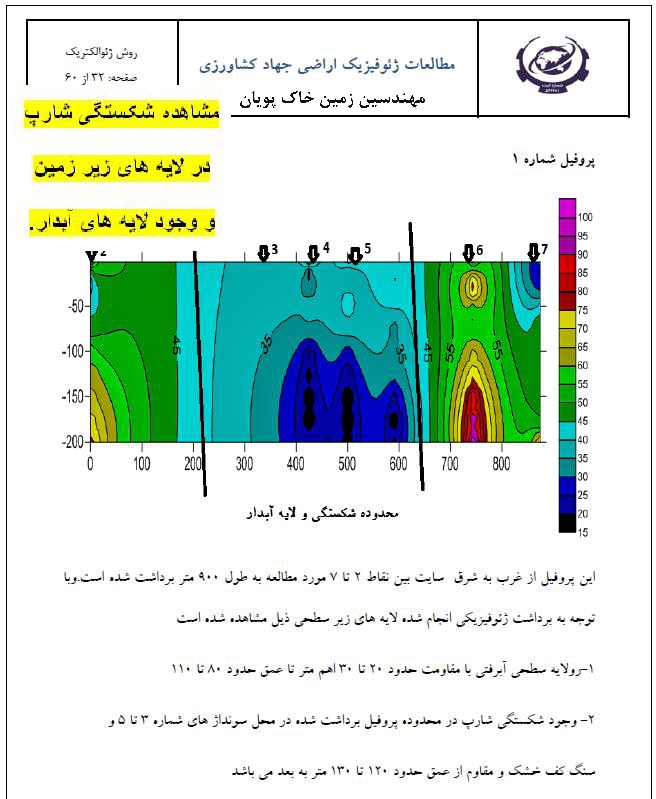 همانگونه که در تصویر بالا مشاهده می کنید تفکیک لایه بندی با روش رزیستویتی متری انجام گرفته است و به علت وجود ریز گسل ، بافت آبدار مناسبی در زمین جهت حفاری مشاهده گردیده است که بهترین محل جهت حفاری و دسترسی به آب می باشد.