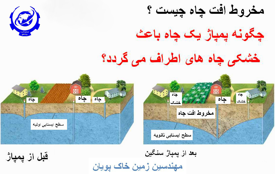 همانگونه که در تصویر مشاهده می کنید ؛قبل از شروع پمپاژ توسط چاه وسط تصویر ؛چاه های آب کناری از دبی مناسب خروجی برخوردارند اما با شروع عملیات پمپاژ توسط این چاه سطح ایستابی به شدت پایین رفته و چاه های اطراف عملا بی آب و خشک می گردند.